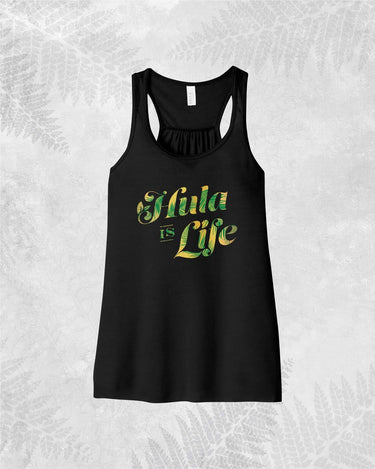 Hula is Life Merrie Monarch Hulu Wahine Tank in gold and green, featuring Hawaiian-inspired design on a sleeveless tank top.